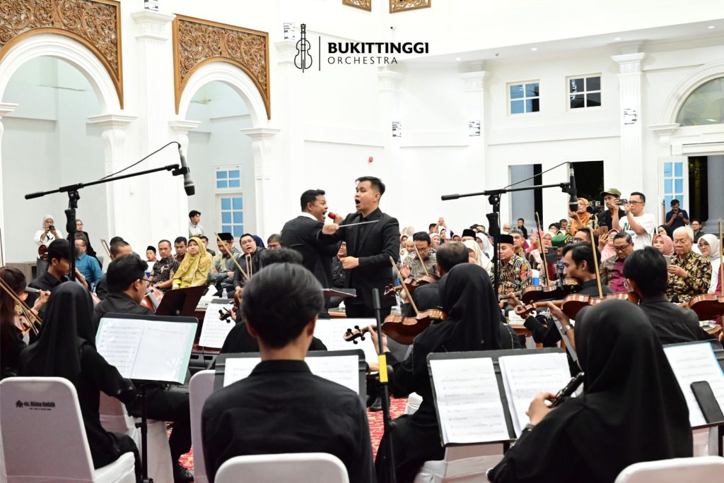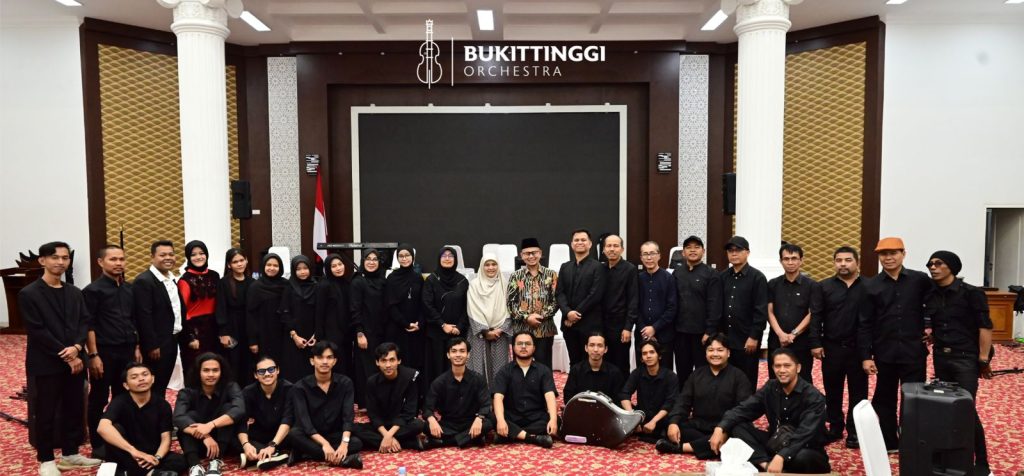 Bukittinggi, 12 Agustus 2025 – Puncak peringatan 123 tahun kelahiran Bung Hatta di Bukittinggi berlangsung khidmat dan meriah dengan penampilan Bukittinggi Orchestra. Acara digelar di Balairung Rumah Dinas Walikota Bukittinggi dan dihadiri oleh pejabat-pejabat penting, di antaranya Wakil Walikota Bukittinggi, Ketua Yayasan Proklamator Bung Hatta (YPBH), serta sejumlah tokoh daerah dan nasional. Menariknya, banyak anggota Bukittinggi Orchestra merupakan dosen Jurusan Musik Film yang terlibat langsung, baik sebagai pengisi maupun pengarah musik. Mohammad Dary, S.Sn., M.Sn., dosen Musik Film ISI Padang Panjang, dipercaya sebagai Music Director sekaligus Conductor. Selain itu, Dr. Fahmi Marh, S.Sn., M.Sn., Ketua Jurusan Musik Film, serta Nora Anggraini, S.Sn., M.Sn., juga turut ambil bagian sebagai anggota orkestra.
