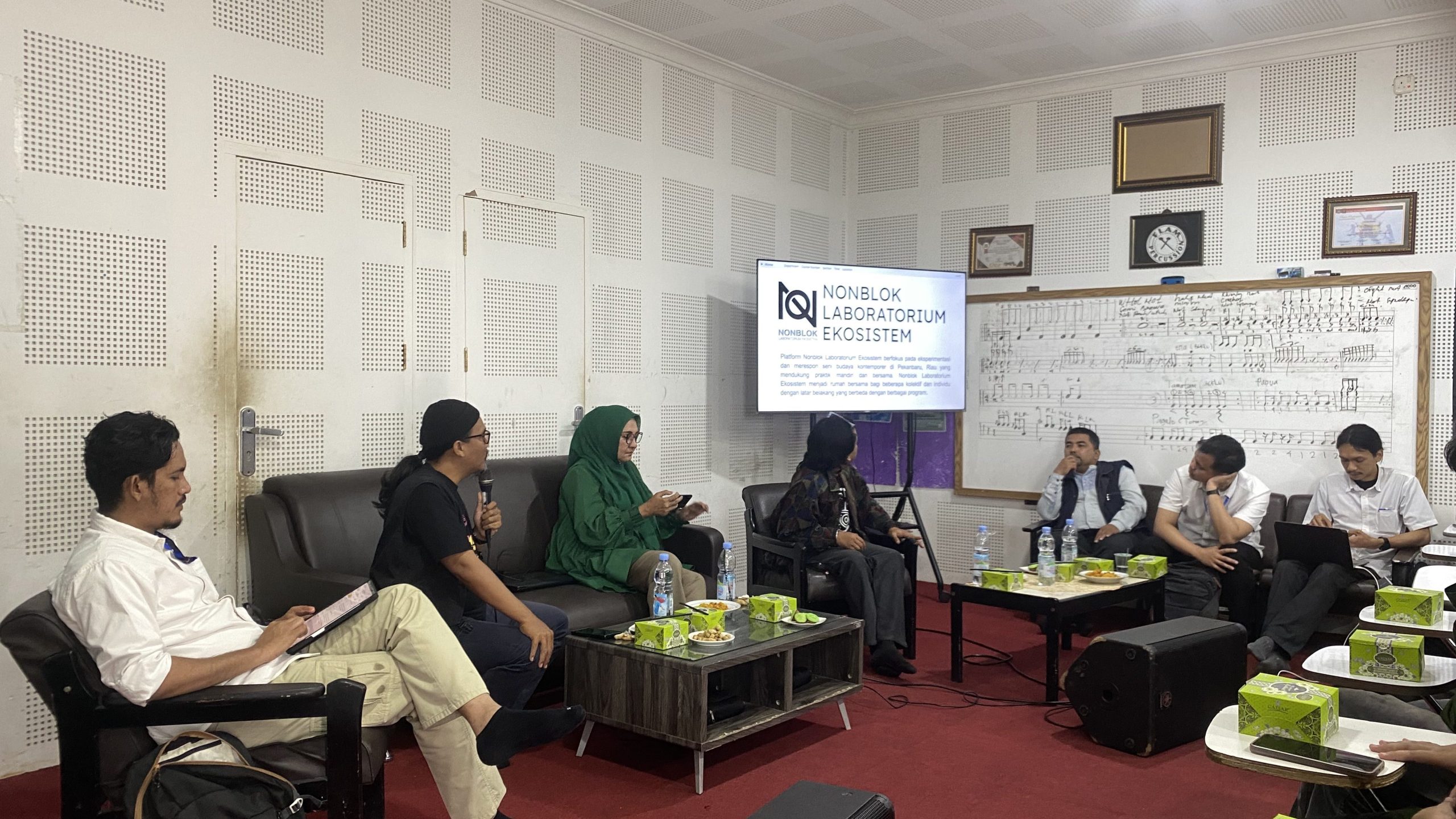 Sementara itu, Husin S.Sn., M.Sn., penggiat komunitas Cinepelan, memaparkan pentingnya kolaborasi multidisiplin sebagai ruang belajar bersama. Ia mencontohkan berbagai kegiatan komunitasnya, mulai dari program eksperimen audio-visual “Memekak”, kelas seni peran “Cuman Ekting”, hingga program daur ulang kreatif “Operasi Asoy”. Kegiatan tersebut tidak hanya memperkaya pengalaman seni, tapi juga mendorong terbentuknya ruang-ruang edukasi informal yang produktif. Dari perspektif seni media, Haviz Emriadi, S.Ds., M.Sn., dari IBBT Institute menjelaskan perkembangan dan definisi seni media sebagai seni yang menggunakan media teknologi sebagai medium utama. Ia menyoroti ciri khas seni media yang eksperimental dan interaktif serta perjalanan sejarahnya sejak video art pada 1970-an hingga seni berbasis teknologi terkini seperti VR, AR, dan AI. Haviz juga menjelaskan beragam bentuk seni media, termasuk video art, instalasi interaktif, hingga performance art berbasis suara dan elektronik.