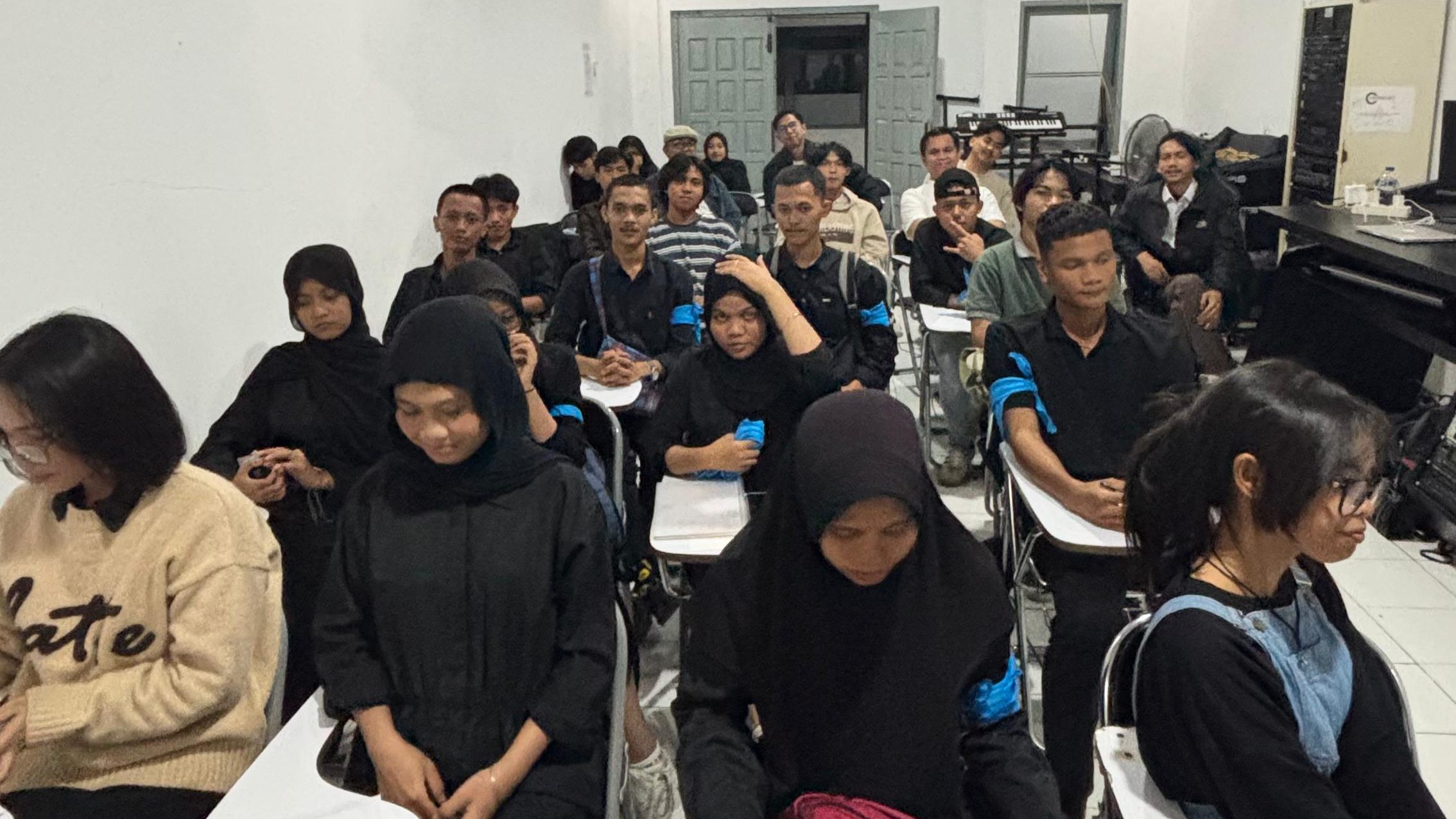 Pembahasan pada tahap pra hingga produksi menjadi titik awal perjalanan ini. Sejumlah mahasiswa ikut terjun langsung dalam proses shooting, di antaranya berperan sebagai sound recordist, operator boom mic, hingga clipper. Nuzul dan Rifqy, mendampingi proses pengambilan suara di lapangan, memastikan kualitas input audio terjaga sesuai kebutuhan produksi. Pengalaman ini memperlihatkan bahwa kerja teknis tidak hanya soal menguasai peralatan, tetapi juga membaca konteks adegan serta mengantisipasi dinamika di lokasi. Hal ini selaras dengan pandangan Altman (1992) bahwa “sound production is always a negotiation between technology, environment, and creativity.” Pascaproduksi kemudian membuka dimensi lain dari kerja audio. Raihan mengambil peran sebagai komposer scoring, dibantu Yuli sebagai asisten yang turut mengajukan alternatif gaya musik sesuai arahan sutradara. Dalam prosesnya, mereka tidak sekadar menyusun struktur musikal, melainkan merancang strategi agar musik mampu menempel erat dengan emosi dan mendukung unsur naratif dari visual. Dubbing dilakukan di studio podcast, sementara Nuzul dan Rifqy menekuni sound design dengan pendekaataan kerja foley dari sumber bunyi sederhana: gesekan kertas, langkah kaki, hingga bebunyian hembusan angin. Seluruh rangkaian pengerjaan berlangsung sekitar tiga minggu, dua minggu untuk scoring dan satu minggu untuk sound design. Meski demikian, perjalanan ini tidak bebas kendala. Satu di antara hambatan muncul dari persoalan ketersediaan ruang kerja, sementara di sisi lain dinamika komunikasi juga menjadi tantangan, terutama bagi komposer yang membutuhkan waktu lebih untuk mengartikulasikan gagasannya. Situasi semacam ini justru membuka refleksi tentang pentingnya manajemen kerja, strategi komunikasi, dan ketahanan tim dalam produksi kreatif. Sebagaimana pendapat Becker (1982), “art worlds depend on cooperation, and cooperation always involves negotiation.”