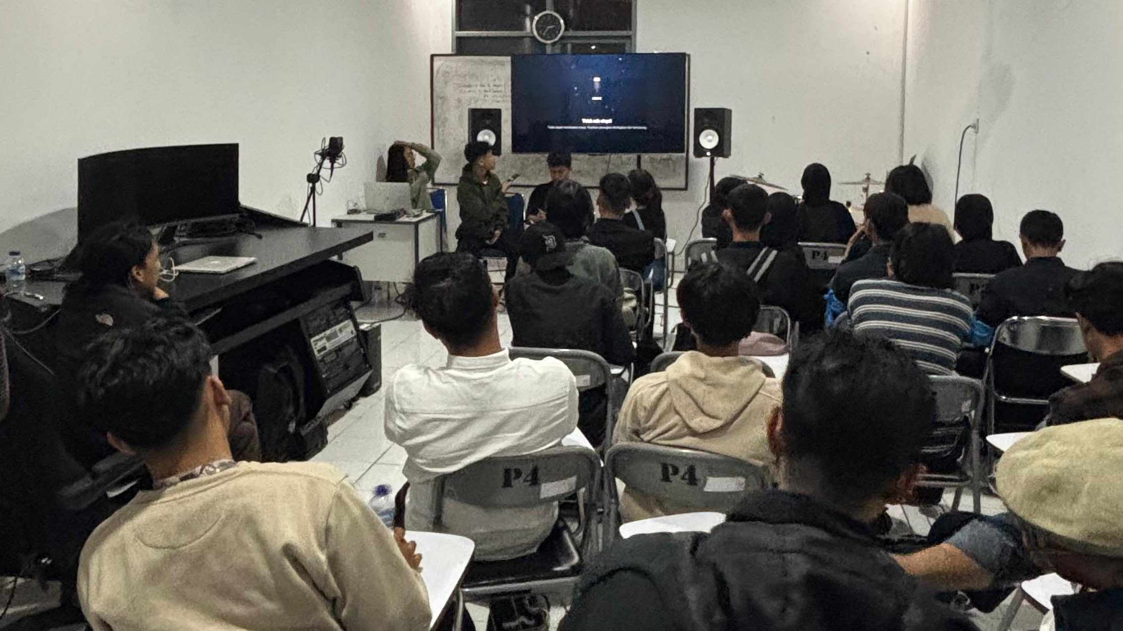 Sesi diskusi dilanjutkan guna mengiringi bedah karya serta memperkaya pemahaman peserta. Dr. Sn. Fahmi Marh, S.Sn., M.Sn., selaku ketua prodi, mengawali sesi diskusi dengan memberikaan penekanan terhadap pentingnya presentasi detail oleh setiap anggota tim, agar mahasiswa baru dapat memahami metode kerja secara konkret. Kemudian disambut dengan pertanyaan dari mahasiswa baru, M. Habi mengajukan pertanyaan tentang penggunaan instrumen non-musikal dalam penggarapan scoring film. Menjawab hal ini, tim presenter menjelaskan bahwa selain instrumen musik, komposer juga menambahkan ambience, termasuk efek bebunyian yang dimanipulasi guna membangun nuansa mistis. Sedangkan Vindo Alhamda, S.Sn., M.Sn., selaku dosen Musik Film yang menghadiri forum tersebut, mengulik lebih jauh tentang workflow post-production serta keterlibatan komposer dalam bedah naskah yang ditanggapi oleh presenter dalam menjelaskan tentang pemetaan suara sesuai arahan sutradara, hingga meninjau kembali final cut sebagai bahan evaluasi. Pandangan kritis juga datang dari dosen Musik Film lainnya,  Hafif HR, S.Sn., M.Sn., menekankan nilai kolaborasi lintas disiplin. Baginya, kerja multidisiplin dalam film menuntut dramaturgi yang mampu menyatukan elemen diagetik, non-diagetik, hingga trans-diagetik. Beliau menambahkan, keberanian mempresentasikan proses kerja adalah bagian dari pembelajaran penting, karena dari sanalah muncul jawaban-jawaban baru. Rama Anggara, M.Sn juga memperkuat gagasan ini dengan menekankan pentingnya keterampilan presentasi oral di ruang publik. Menurutnya, pengalaman semacam ini adalah momentum berharga: “teman-teman dapat merasakan bagaimana ‘debar kesatria’ itu hadir di dalam personaalitas, sehingga harus siap membangun argumen dan opini persuasif dalam narasi kerja yang proporsional.” Sementara itu, M.Dary, S.Sn., M.Sn., selaku pembimbing HMJ memberikan apresiasi sekaligus menegaskan bahwa forum seperti ini menjadi sarana penting untuk menumbuhkan tradisi akademik yang sehat. Baginya, keterbukaan dalam berbagi pengalaman memperkuat solidaritas sekaligus memperkaya wawasan mahasiswa.